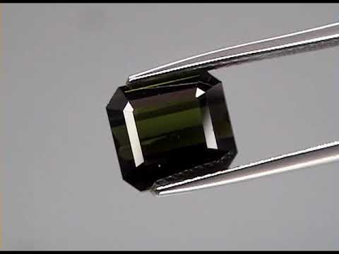 This superb natural tourmaline exhibits full color saturation with a dark tone, silky luster, and rich dark olive green hue. The combination of its emerald cut and tight faceting makes this gemstone a natural choice for an elegant evening setting. It measures an impressive 9.4mm x 8.6mm x 6.1mm, and is unheated. Sourced from Mozambique.