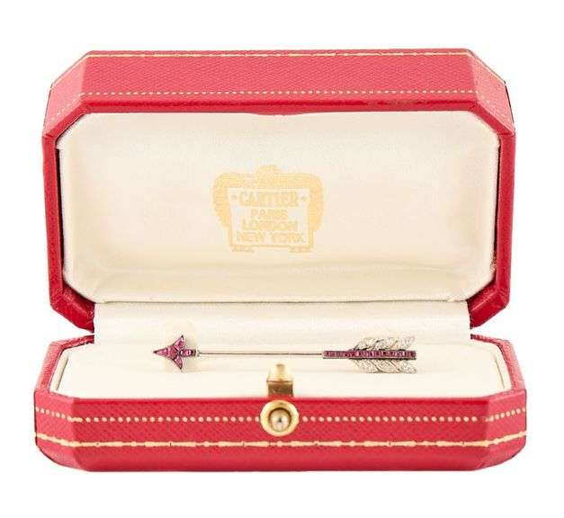 Vintage Cartier Ruby and 0.15ctw Diamond Art Deco Jabot Brooch in Platinum. Brooch Length: Approx. 50.0 MM. Weight: Approx. 2.70 Grams. Stamped: CARTIER, 3462. Original Box.