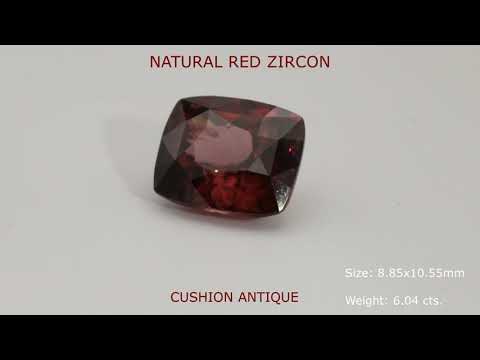 Very attractive and rare natural, untreated red zircon. Very clean stone with fine faceting. A truly superior stone. This faceted cushion antique gem measures and 8.85x10.55mm; its has a weight of 6.04 cts.