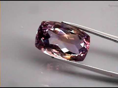 The classic cushion faceting of this ametrine creates a halo of high fire flashing that surrounds a central oasis of VS ametrine. It has a multi-color hue displaying well blended violets and golds with medium saturation that glistens under a superior luster. It measures an impressive 18.5mm x 11.7mm x 9.5mm, and was sourced from Bolivia. Unheated!