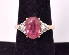 Darling 3.2CTS Ruby and 0.10CTW Diamonds Ring in Gold Plated Sterling Silver. This wonderful sterling silver ring showcases a lovely oval cut ruby center stone with two round cut diamond accents. Total weight 2.9 grams. Size 6 3/4.