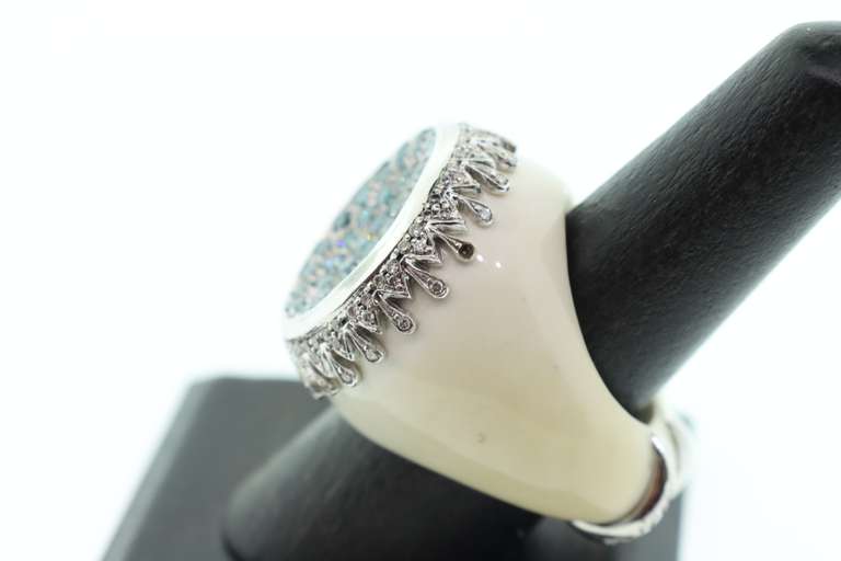 LADIES VERY UNIQUE IVORY RING WITH OVER 3.00 CARATS OF DIAMONDS SET IN 18K WHITE GOLD. IT HAS ALL ROUND BRILLIANT CUT DIAMONDS SET IN PAVE SETTING. DIAMONDS ARE WHITE AND BLUE. RING IS SIZE 7.5, DIAMETER IS 25MM. CONDITION IS MINT-NEVER WORN. STAMPED ROCANI AT BOTTOM.