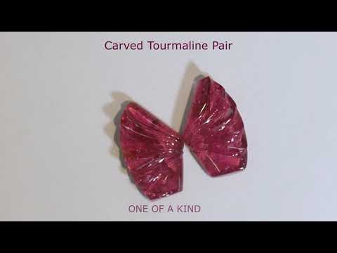 Natural, untreated vivid pink tourmaline. This hand-carved and hand-polished pair of angel's wings measures approximatelyu 12.5x20.4mm. The pair has a total weight of 18.89 cts. Masterfully carved tourmaline pairt with stunning natural color!
