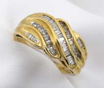 Sparkling 10k yellow gold dome style ring with numerous round and baguette diamonds. The ring weighs 5.0 grams.
