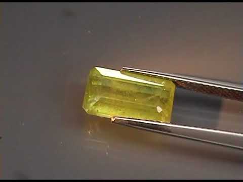 This lovely example presents a bright greenish yellow hue under a superior luster. Sphenes share the same refractive pattern as diamonds, and this piece shows electric linear flashing in vibrant yellow. It measures 12mm x 7.1mm x 4.6mm and is untreated!