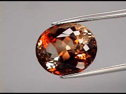 This is a gorgeously colored example of Brazilian topaz. It has a deep amber hue center with golden champagne swirling on either side with fantastic saturation all through fantastic eye clarity. The oval cut creates brilliant, yet understated flashing, and its fire is amplified by its superior luster. This impressive topaz measures 14.6mm x 12.2mm x 9.5mm, and has a Mohs hardness rating of 8 out of 10.
