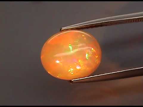 Unlike most opals that need to be turned to certain angles to see their play of color, this opal exhibits constant high fire play of color. It smolders in fiery reds and greens with touches of gold in a layered floral pattern. This piece has a smooth cabochon surface with a medium domed cut, and measures 10.5mm x 8.7mm x 4.8mm. Sourced from Ethiopia. Untreated.