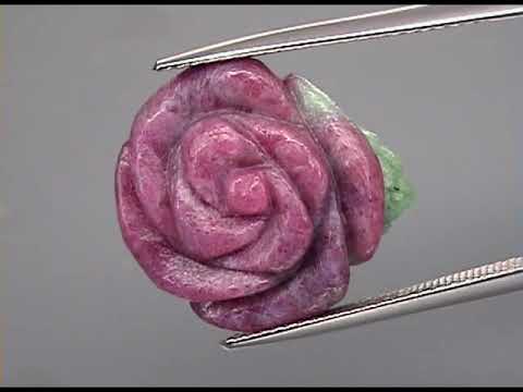 Created over millions of years, the captivating violet-red ruby seamlessly integrates with the bright green zoisite, resulting in a carving that showcases a remarkable and dramatic color palette. The intricately detailed petals display a glossy luster that enhances their curves, producing distinct interplays of highlights and shadows. Every element of this carving is entirely natural, without any treatments, and it measures an impressive 17.5mm x 16.5mm x 9.5mm. Sourced from Tanzania.