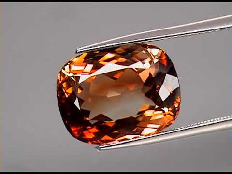 This remarkable gem exhibits rich color saturation through pristine eye clarity with dazzling flashing. It features a tightly faceted elongated cushion cut that is complimented by its superior luster, and measures an impressive 15.4mm x 12mm x 8mm. The color palette of this topaz is rich and well blended, presenting lush red amber and whiskey hues accented by golden ambers. Sourced from Brazil.