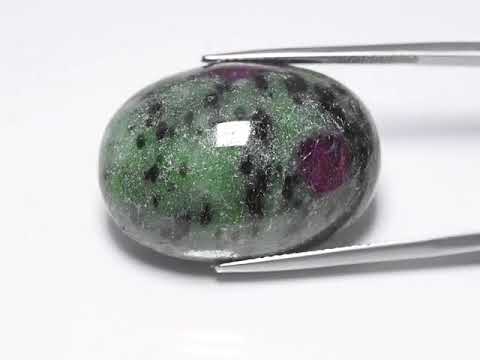 This all natural gem has a serious wow factor. The lush green and black Zoisite covers most of the gem with a dramatic touch of Ruby under a glossy liquid luster. This elegant gem has a medium domed cabochon cut and measures an impressive 26mm x 18.5mm x 12.2mm. Sourced from Tanzania. Untreated!!!