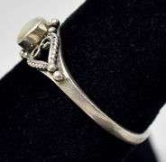 Mother of Pearl Gemstone Ring in Sterling Silver. This adorable sterling silver ring displays oval cabochon mother of pearl gemstone in a bezel setting adorned with an open silver work heart design on each shoulder. The size of this ring is 7 1/2. Total weight is 1.6 grams.
