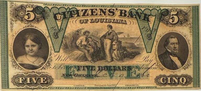 1860 $5 Citizens Bank of New Orleans Note. Dated and numbered but never signed Maybe a remainder Fresh and clean with a decorated reverse as well. Nice hand cutting and inking