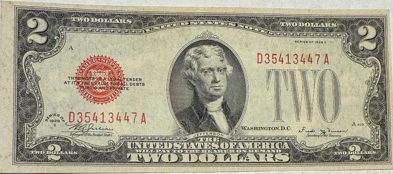 1928 E Unc $2 Red Seal US Note. Fr 1506. Nice flat note with fine fibers. Short right margin. Nice Monticello vignette. Rich red seal. Popular denomination and first series of US small size notes