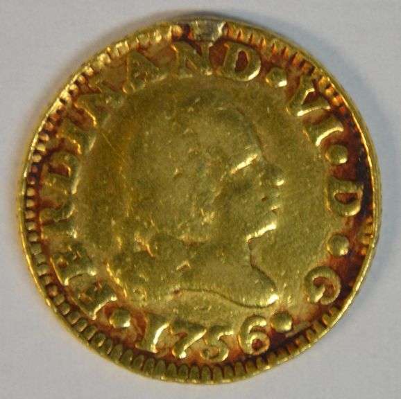 Scarce, early 1756 Spanish Colonial Half Escudo Gold Piece in nice condition, albeit cleaned.
