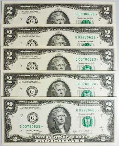 Five Two Dollar 2017A Star Replacement Notes. From The Federal Reserve Bank Of Chicago. Superb Crisp Examples. Well Centered With Great Margins, Bold Ink, Exceptional Paper Quality, And Consecutive Serial Numbers!!