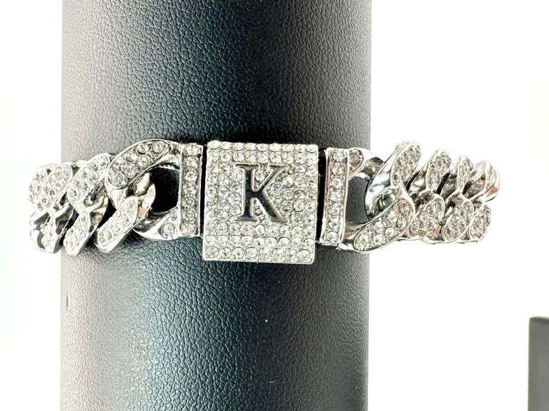 14 Kt. White Gold Plate 36.4 Gram Monogramed Initial "K" Curb Link Bracelet